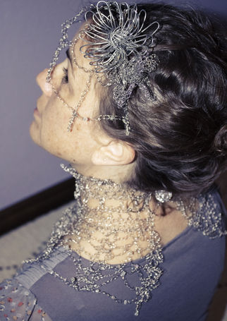 This is a mobile I created by crocheting metal wire, including glass beads and bells. As I walked through San Francisco in the early morning hours on my way to class, I noticed how the sun lit up the water bubbling out of a fountain. I was inspired to create a sculpture piece that seemed to spring up and overflow like a fountain of hope and would catch and play with the sun in a similar way. This piece is made up of two pieces that turn independently of one another with the wind.